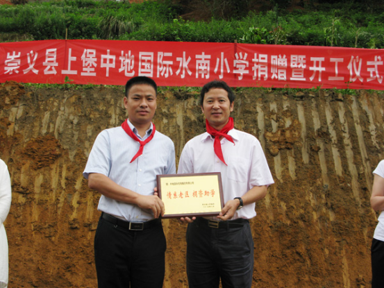 2015年8月21日,中地国际控股集团捐资助建崇义县上堡乡中地国际水南小学签约仪式在江西省赣州市崇义县上堡乡水南村举行,中地国际控股集团公司董事长刘永亮、德邦证券总经理张伟华、崇义县政府副县长黄晓波、县人大主任郭兰、县教育局长赖奇林、上堡乡党委书记张朝晖、中地国际水南小学校长等相关人员出席了本次捐建签约仪式。