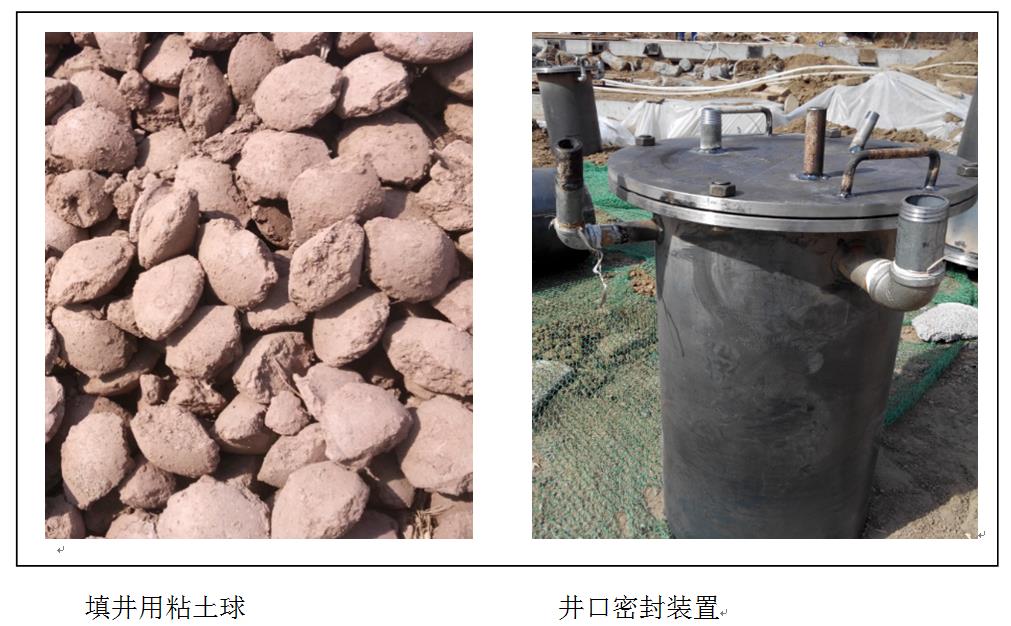 井口地面以下第一层水标高以上位置井管外采用粘土球回填,用水夯实;井口部位采用专用封井装置密封。